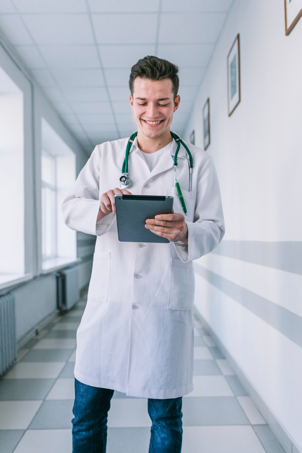 cheerful-young-medic-man-using-tablet